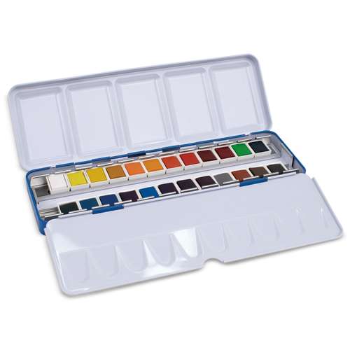 Coffret en métal de 12 ou 24 demi-godets d’aquarelle, dotée d'une palette rabattable et d’un anneau de maintien.