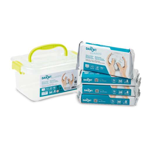 La mallette plastique Darwi Classic est une solution complète et pratique conçue pour les écoles, ateliers créatifs et centres éducatifs. Il contient 4 pains de pâte autodurcissante de 1 kg, prêts à l’emploi pour toutes sortes d’activités de modelage créatif.
