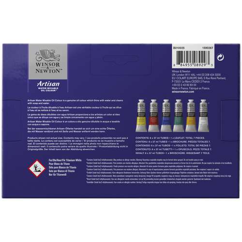 Le Coffret Artisan fabriqué en France est idéal pour s'initier à l'huile soluble Artisan : teinte jaune clair, alizarine cramoisie permanente, outremer francais, vert phtalo bleuâtre, ocre jaune et blanc de titane.
