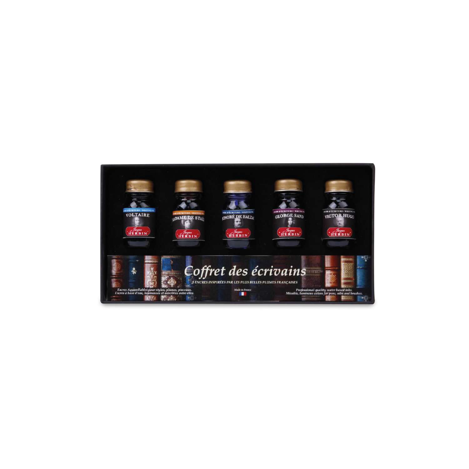 Ce coffret comprend un assortiment de 5 encres de 10 ml avec un bouchon ciré or. Thème des auteurs français du XVIIIe et XIXe siècles.
