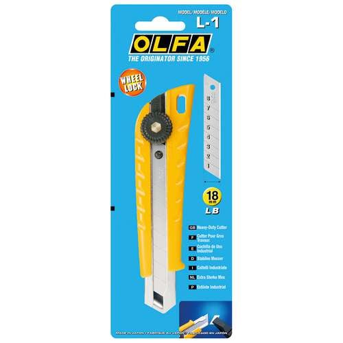 Ce Cutter Universel Olfa L-1 multi-usages connaît un grand succès en raison de sa stabilité et sa qualité professionnelle. Une vis permet le réglage graduel de la lame, intégrée dans un manche en plastique.