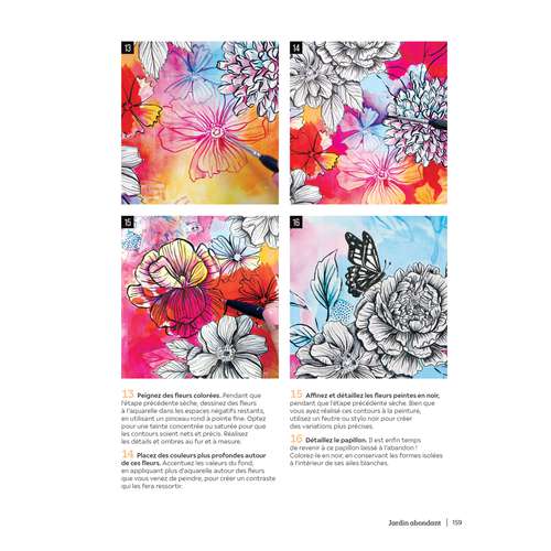 Vous apprendrez à griffonner dans un style libre et personnel, à utiliser les espaces négatifs, à élaborer des compositions monochromes, à concevoir des arrière-plans créatifs, à produire des textures uniques, à coller différents éléments, etc. Dans ces pages, vous trouverez aussi les principes artistiques de base, des astuces pour tracer des lettres à la main et des leçons pour dessiner 12 fleurs différentes.