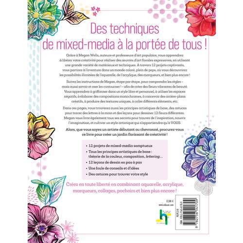 Des techniques de mixed-media à la portée de tous ! Grâce à Megan Wells, auteure et professeure d'art populaire, vous apprendrez à libérer votre créativité pour réaliser des oeuvres d'art florales expressives, en utilisant une grande variété de matériaux et techniques. A travers 12 projets captivants, vous partirez à l'aventure dans un monde coloré, plein de peps, où vous découvrirez les possibilités illimitées de l'aquarelle, de l'acrylique, des marqueurs, et bien plus encore ! Suivez les instructions de Megan, étape par étape, pour comprendre les règles - mais aussi savoir et oser les contourner ! - afin de créer des fleurs vibrantes de beauté.