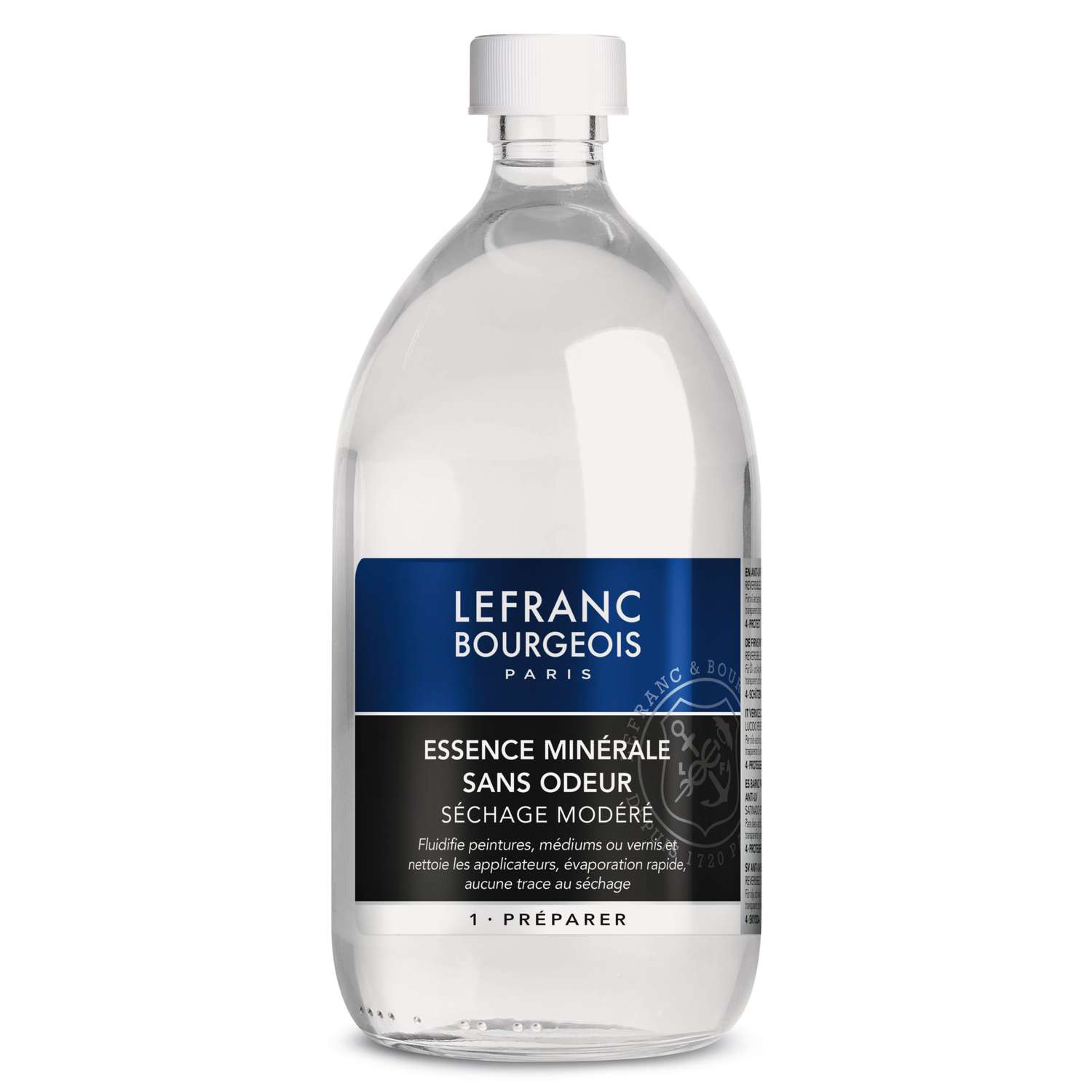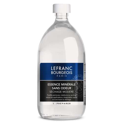 Essence sans odeur de pétrole modifiée qui permet d'offrir aux peintres un solvant agréable à utiliser. Ne laisse pas de trace au séchage. L'essence sans odeur Lefranc & Bourgeois fluidife peintures, médiums ou vernis et nettoie les applicateurs, évaporation rapide. Faible toxicité. Faible odeur. Souple et délicate, conseillée pour le travail en atélier, l'essence minérale sans odeur peut s'associer à différents médiums pour donner un aspect fin à la couleur au travers de la liquéfaction et ceci sans altérer la couleur.