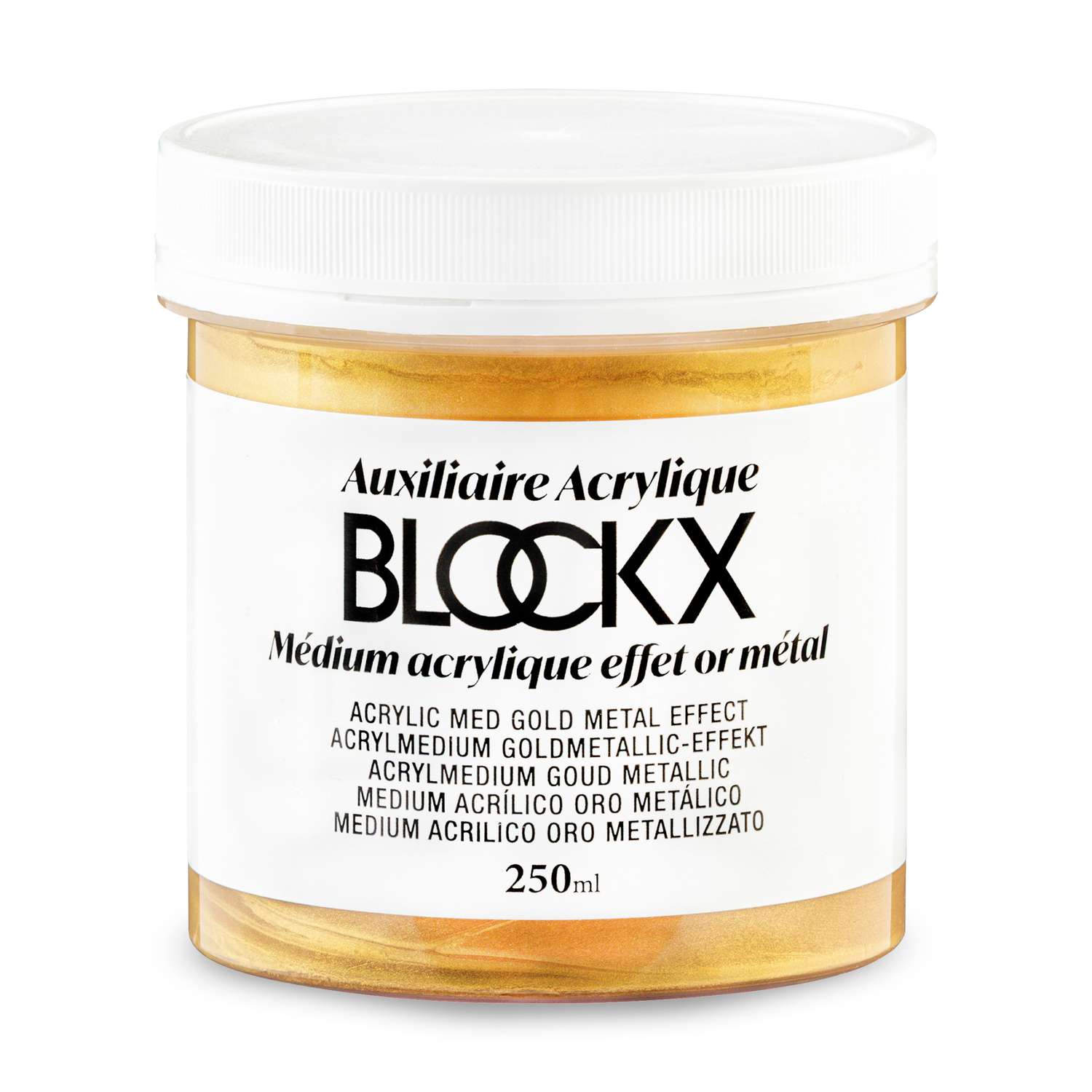 Découvrez le médium acrylique effet Or Métal par Blockx, un additif qui donne un effet doré à vos couleurs. Il ajoute une touche d'éclat qui sublime vos œuvres avec un rendu métallique brillant.