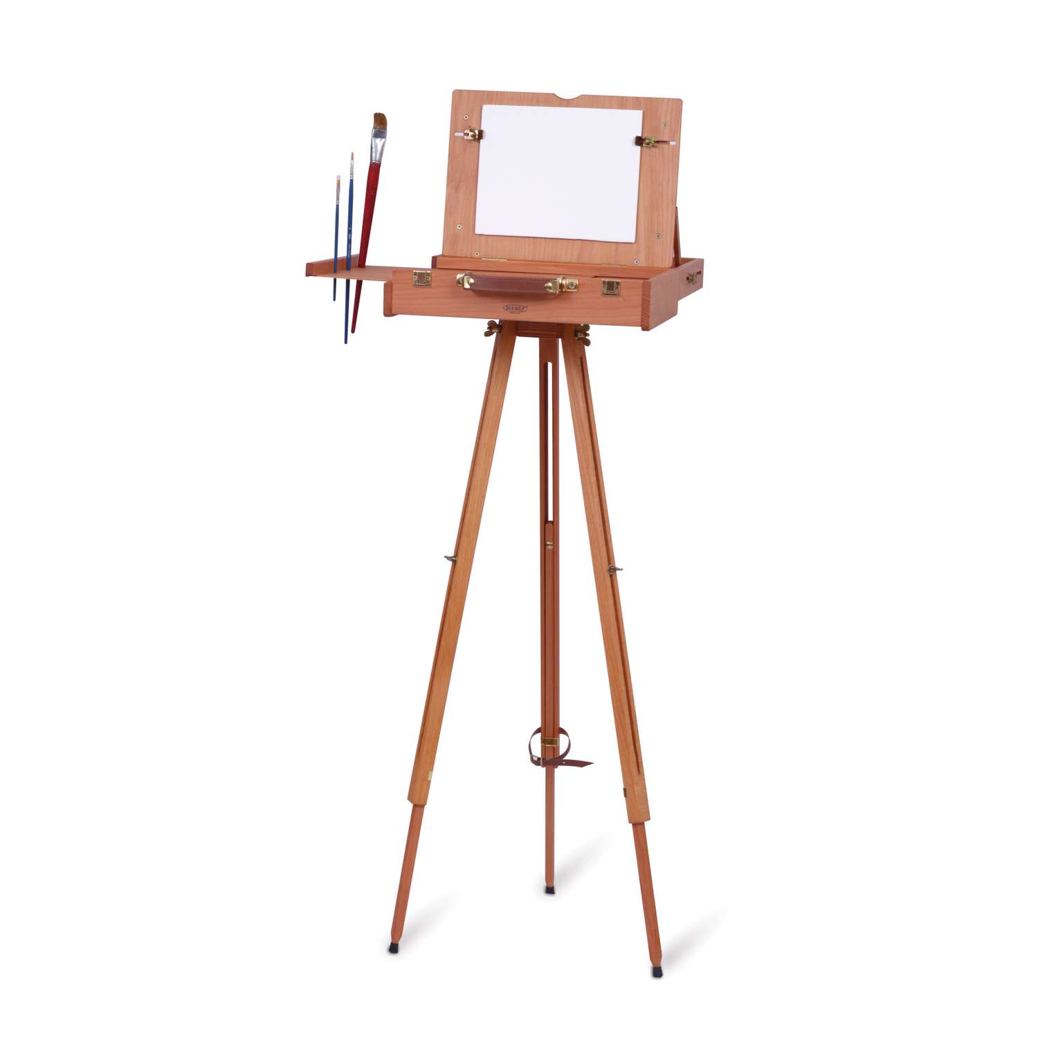 Houten statief van Mabef, driepoot. Onderstel voor de schilderskisten M104 en M10. Luxe uitvoering in in geolied beukenhout. Verstelbare hoogte van 70 tot 116 cm.Bovenblad 18x18 cm. Kan tot 8 kg dragen.Een ideale combinatie voor binnen en buiten.