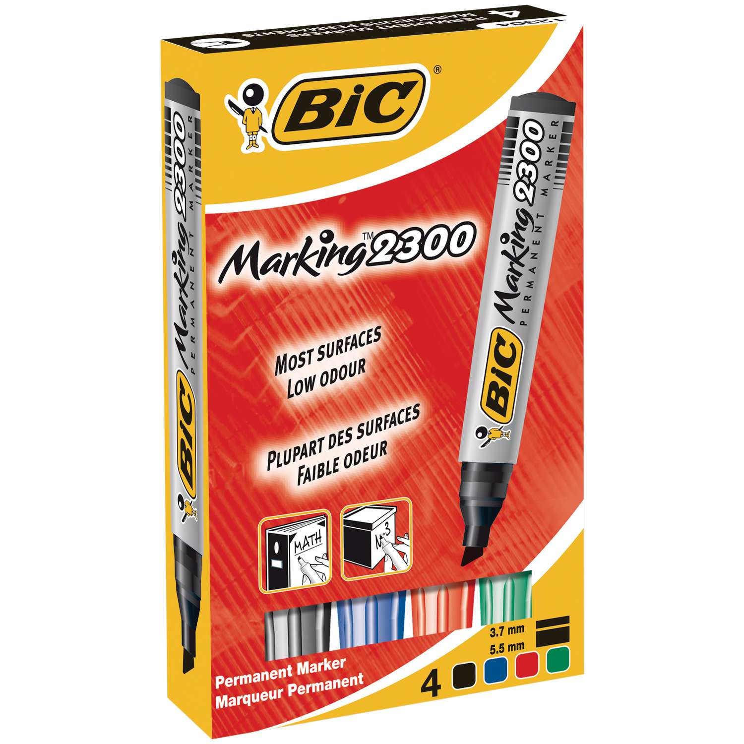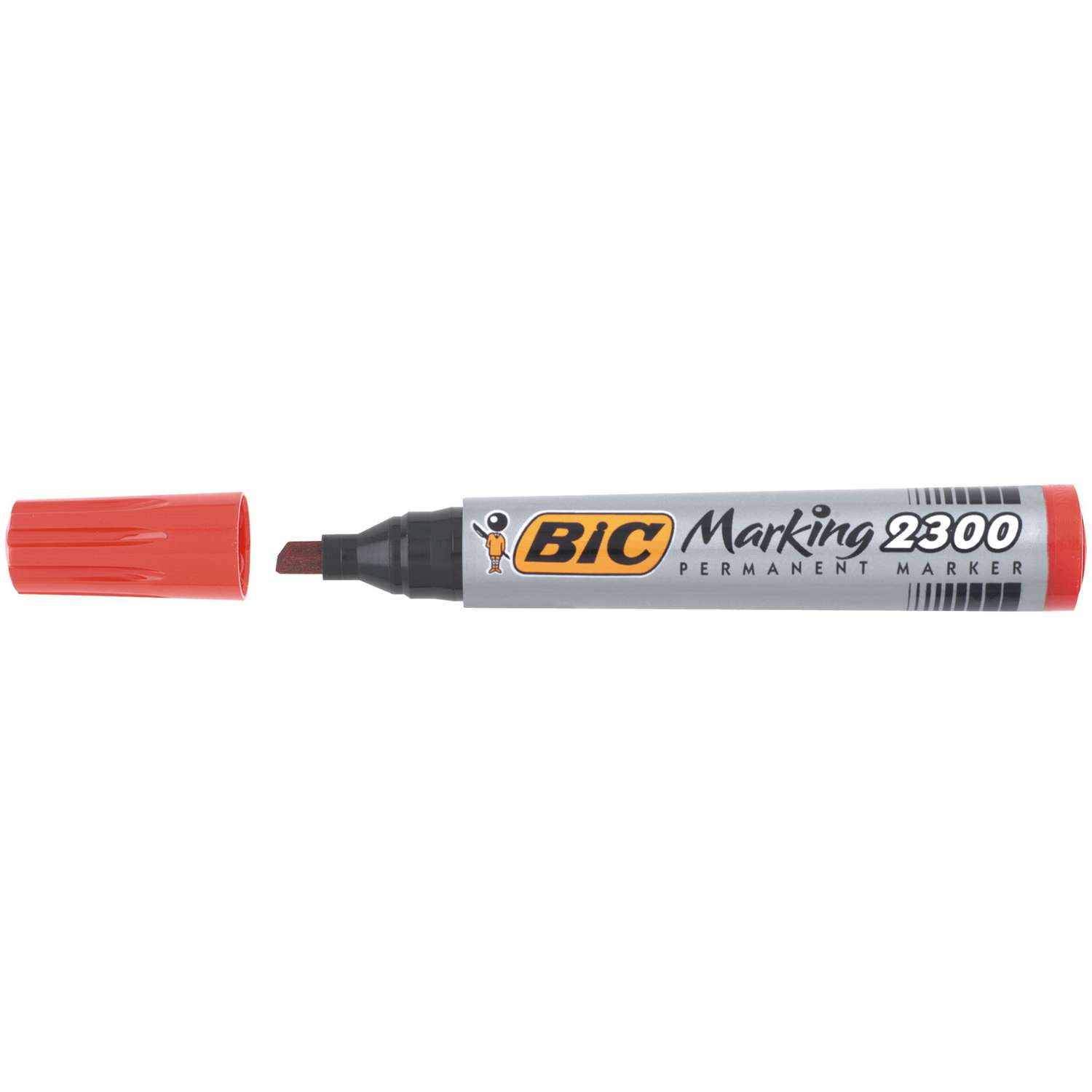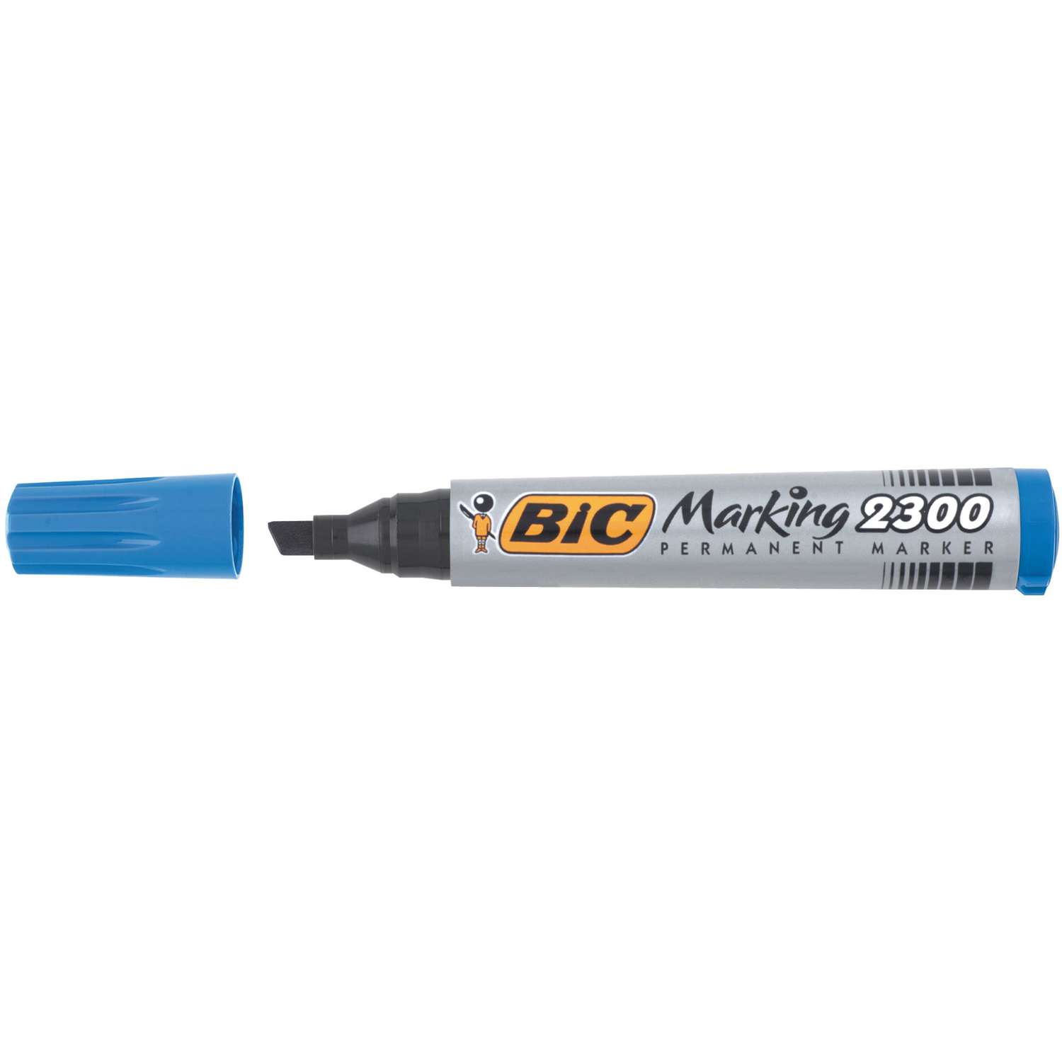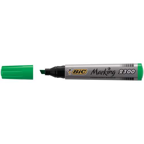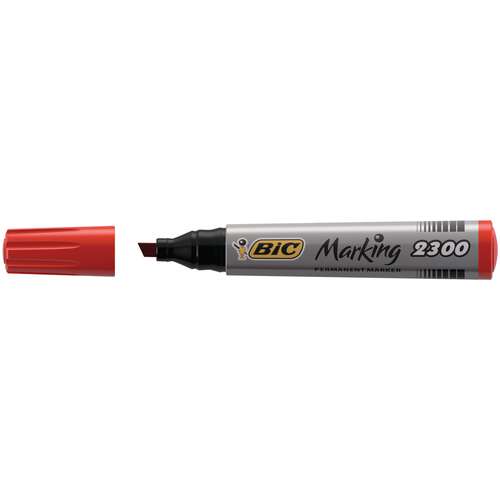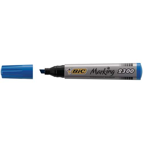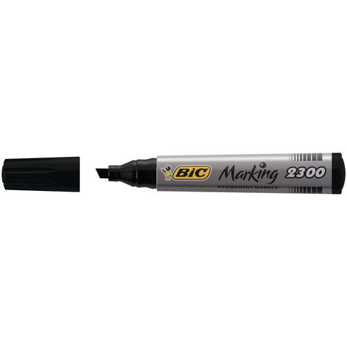 Marker Bic Marking 2300 schuine punt, lijn breedte 3,1 - 5,3 mm. Permanente inkt op basis van alcohol, lichte geur, droogt snel. Kapje met de inktkleur en een afdichtklikje. Product zonder PVC, grote inktinhoud, polyvalent. Lichtbestendigheid voor de zwarte inkt. Wordt gebruikt op veelvuldige oppervlaktes: papier, karton, glas, plastiek, metaal.