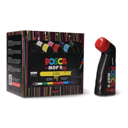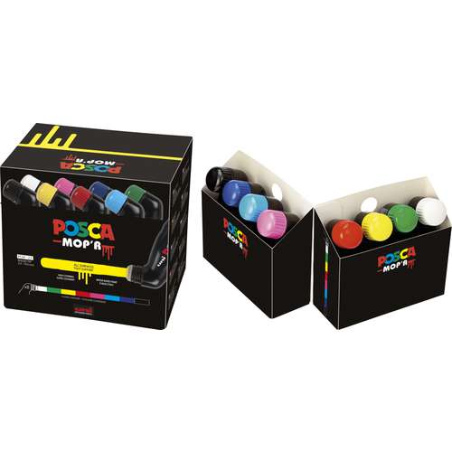 Marker MOP'R van POSCA; ideaal voor grote vlakken. Brede, grote strepen met een dikte van 3 tot 19 mm.Eigenschappen :Inkt op waterbasisZonder alcoholZonder oplosmiddelGeurloosZeer dekkend, opaakRonde punt XXLKleurlijstdonkergroengeelroodrozelichtblauwdonkerblauwzwartPrijs per set