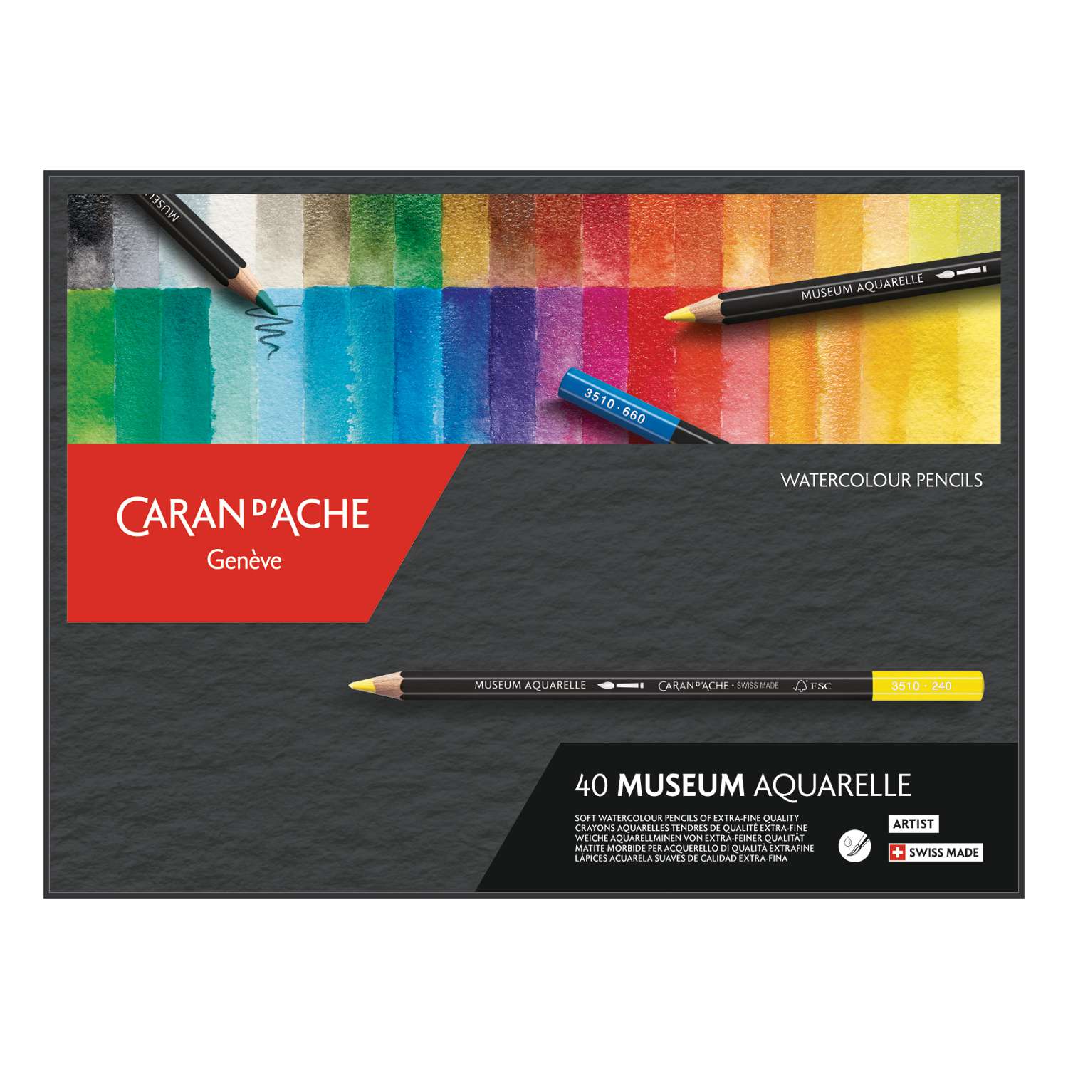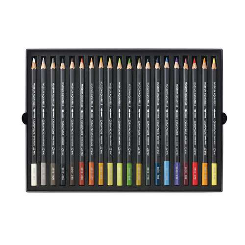 Verschillende CARAN d'ACHE® MUSEUM aquarelpotloden sets. Elk kleurpotlood is watervermengbaar en bevat een extra hoge pigmentconcentratie wat grote kleurintensiteit en buitengewone lichtbestendigheid garandeert. Gemaakt van eersteklas cederhout.