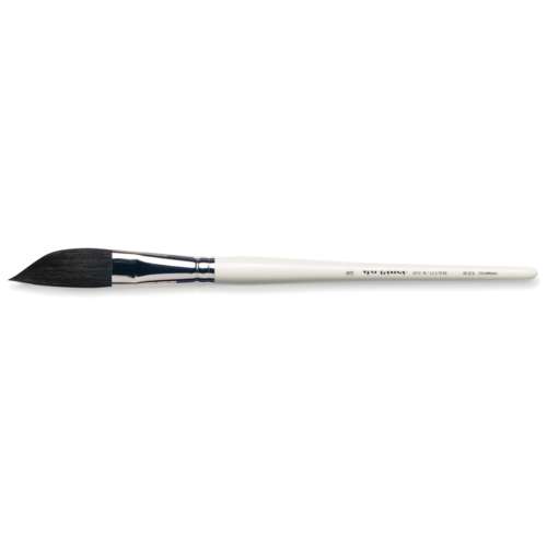 Voor het zijdeschilderen. Ook voor geometrische sujets.Gemaakt van runder(oor)haar dat in zwaardvorm gevat is.Korte, wit gepolijste steel.