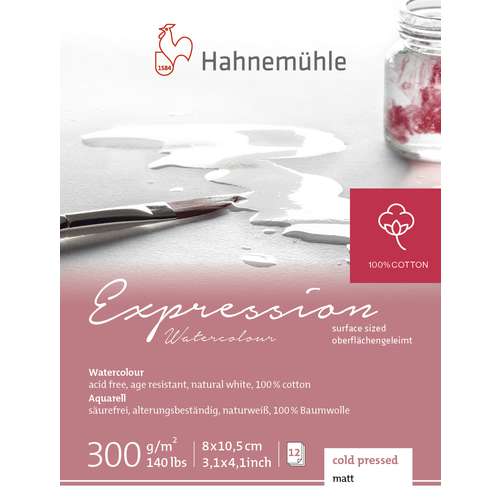 Het Expression aquarelpapier van Hahnemühle bestaat voor 100% uit katoenlinters. Het heeft een fijngekornde oppervlaktestructuur, 300 g/m². Zuurvrij, lichtecht en in hoge mate verouderingsbestendig. In diverse formaten, als blok en als los vel.