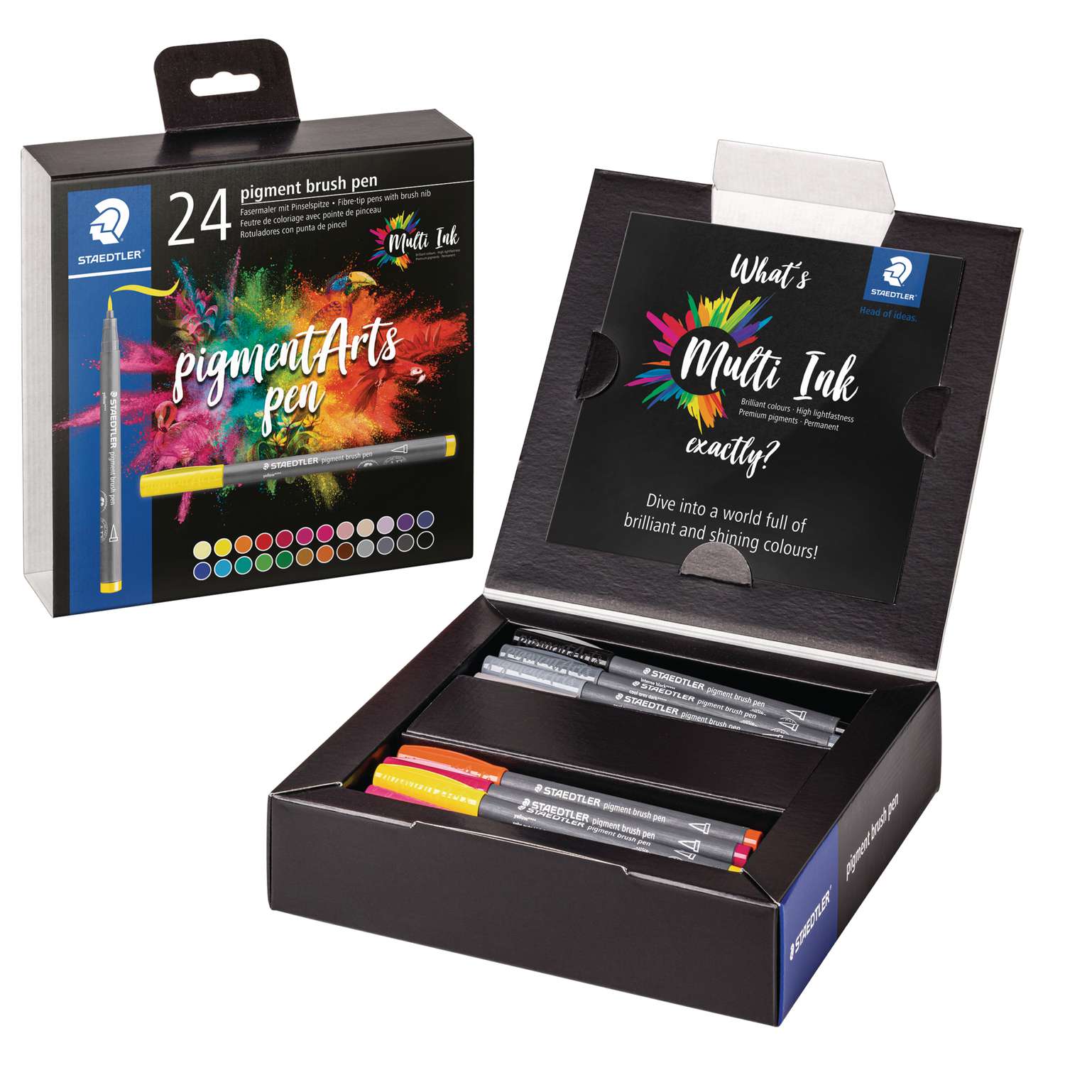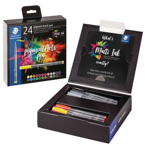 De STAEDTLER | Pigment brush pen — 24-set bevat hoogwaardige vezeltip pennen met brush penpunten en de innovatieve Multi Ink. Deze sets bevatten 12 themakleurige pennen.