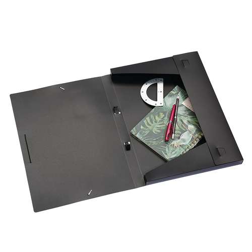 Deze map van zwart polypropyleen is tegelijkertijd extreem licht én superstevig. Hij heeft drie binnenflappen, twee sluitelastieken & halfrond handvat.